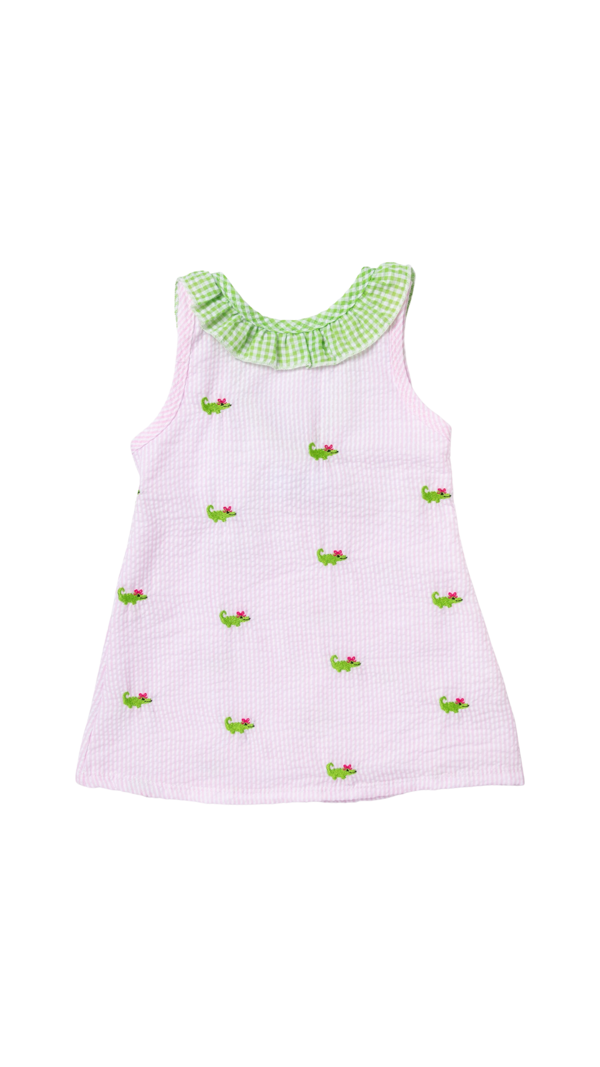 A charming classic with a playful twist, this sweet dress features delicate mini alligator embroidery set against soft pink seersucker. Finished with a statement green bow detail at the back, this dress blends timeless Southern style with adorable whimsy. Perfect for spring outings, special occasions, and everyday dressed-up days.