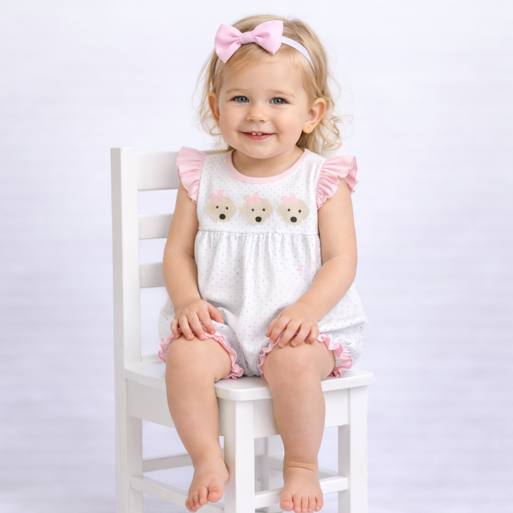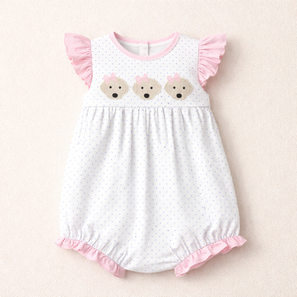 Sweet and full of charm, this darling girl dress features an adorable three dog appliqué paired with soft pink flutter sleeves and light blue dot detailing. Designed with a classic silhouette and comfortable fit, it’s perfect for playdates, parties, and everyday fun with a whimsical touch.
