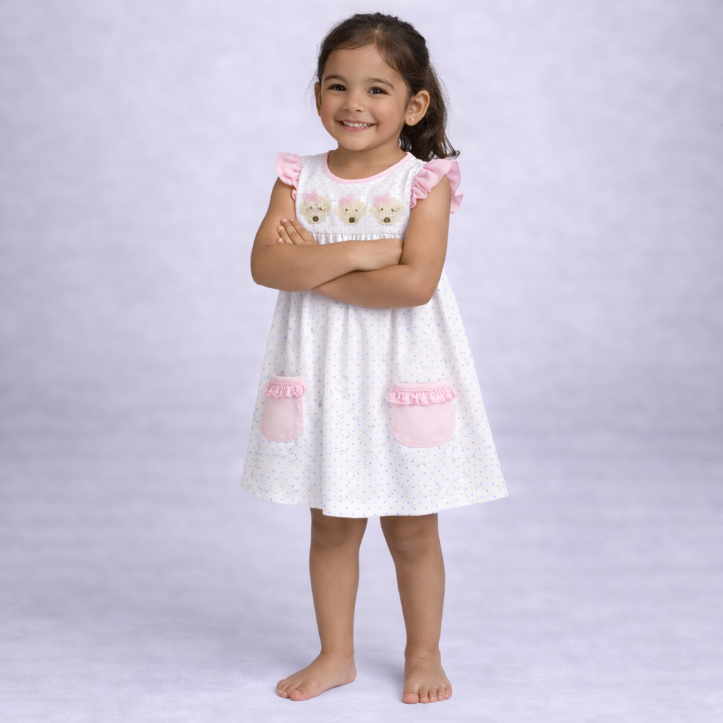Sweet and full of charm, this darling girl dress features an adorable three dog appliqué paired with soft pink flutter sleeves and light blue dot detailing. Designed with a classic silhouette and comfortable fit, it’s perfect for playdates, parties, and everyday fun with a whimsical touch.