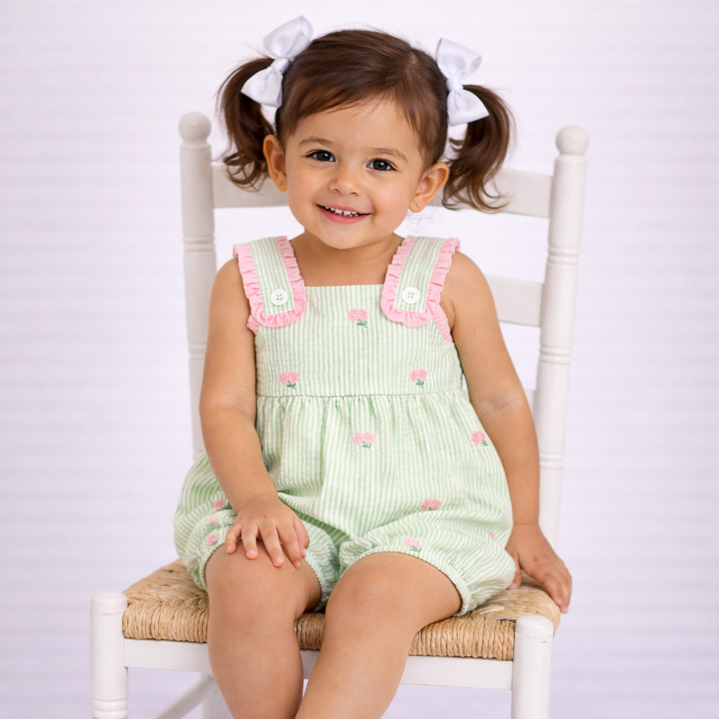 A true springtime favorite, this green seersucker bubble features a sweet azalea flower detail, making it perfect for Masters week or any beautiful spring and summer day. Lightweight and breathable with a timeless bubble silhouette, it’s designed for special occasions and everyday charm alike.